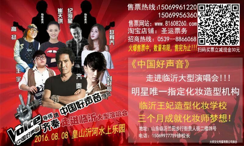 八月活动 8.4号美丽婚约婚礼:新娘跟妆(美妆师明明) 8.5号萌芽艺术学校大型舞蹈演出 王妃化妆造型 8.8号齐秦携中国好声音大型演唱会, 齐秦,赵宥乔,崔天琪,刘籽辰,高扬,王宇等 唯一指定化妆造型:王妃造型 (造型师:芳芳老师,青心,林雪,宋静,悦悦,杨慧,) 地点:临沂市河东区黄山沂河水上乐园 8.6~7号自然排毒旅游嘉年华 8.20~23号2016临沂婚博会大型展厅, 200对集体婚礼,婚礼秀新娘特邀王妃造型化妆